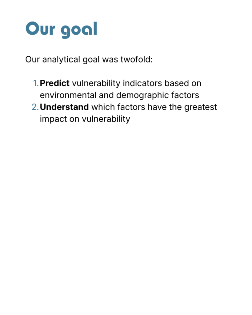 Since interpretability was a key requirement, we used permutation importance to quantify the impact of each factor. This method measures how much model performance changes when a single variable is altered, allowing us to identify which environmental and demographic characteristics contribute most to vulnerability.